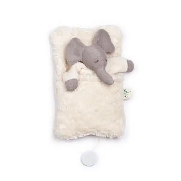 Con il suo corpo di morbido tessuto grigio e le delicate sfumature sui piedini, questo elefantino è un invito ad addormentarsi serenamente. Avvolto in una morbida copertina color crema, offre una sensazione di sicurezza e conforto, mentre la dolce melodia che emana al tirare del cordino è ideale per cullare i sogni dei più piccoli.