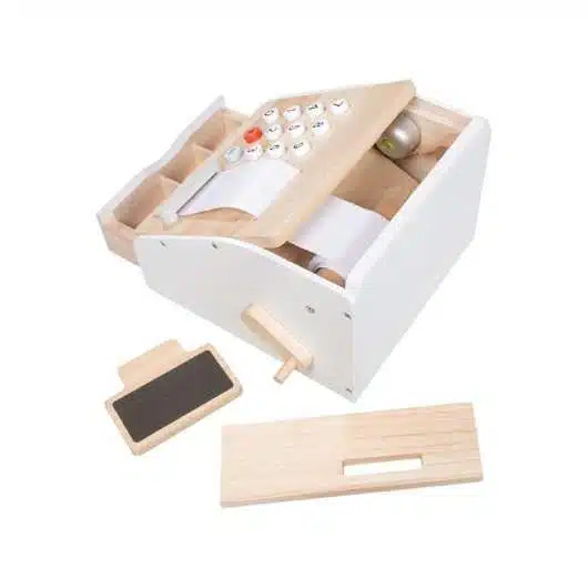 Il registratore di cassa in legno Goki suona con una campanella ogni volta che si apre lo sportello.