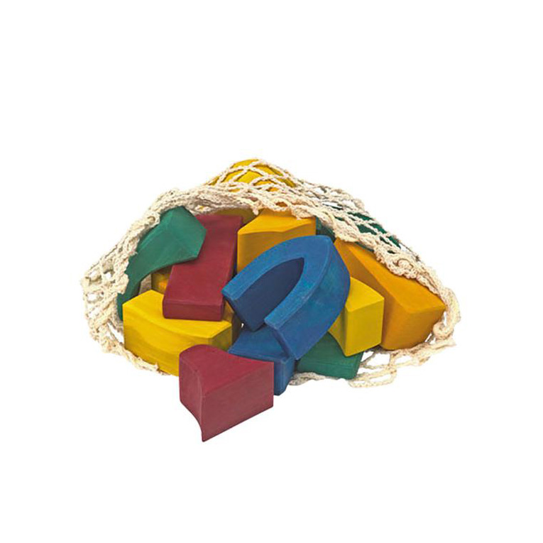 Costruzioni in legno di tiglio colorato dentro una rete di cotone.