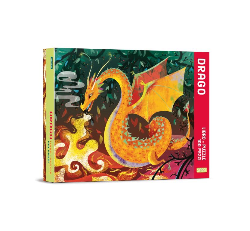 Una scatola dai dettagli iridescenti contenente un puzzle e un libretto dedicati al grandioso protagonista della fantasia di ogni tempo: il drago.