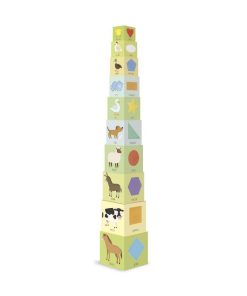 Dieci robusti cubotti da impilare e inserire l’uno nell’altro a matrioska. Accompagnato da un libretto illustrato per imparare i numeri e gli animali leggendo e giocando.