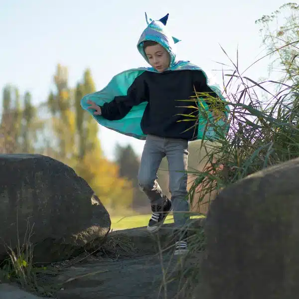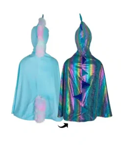 Con colori vivaci come blu acquamarina, lilla e rosa, arricchiti da effetti metallici e arcobaleno, questo mantello è perfetto per ogni piccolo avventuriero.
