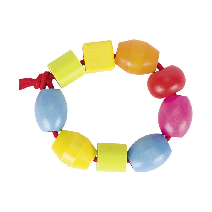 Perline di legno di varie forme e colori. Nel set ci sono anche 6 nastri colorati per poter fare collane e braccialetti.