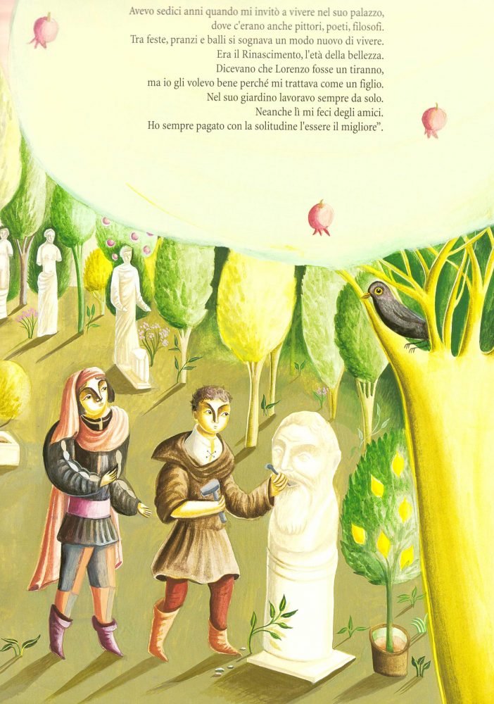 Michelangelo in una lontana notte del 1564, vecchissimo, dall’aspetto trasandato e dal carattere tutto spigoli, ripercorre la sua vita che sta ormai per concludersi. Attraverso lo sguardo limpido di un bambino, ci parla delle opere di scultura, pittura e architettura che hanno fatto di lui, alla pari di Leonardo da Vinci, il genio del Rinascimento.