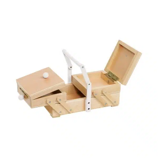 Realizzata in legno robusto, questa cesta da cucito è dotata di un pratico manico bianco e di 3 scomparti, offrendo ampio spazio per riporre aghi, fili, forbici e altri accessori.