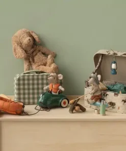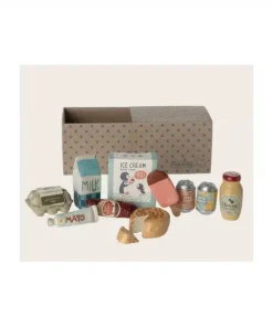 Tutto il cibo di cui il tuo amico Maileg ha bisogno. Questa selezione di cibo include maionese, latte, barattolo di miele, salsiccia, 4 bastoncini di gelato, cartoni per le uova, 2 lattine di soda e formaggio. Viene fornito in una scatola di cartone. Piccole variazioni potrebbero verificarsi nel dipinto.