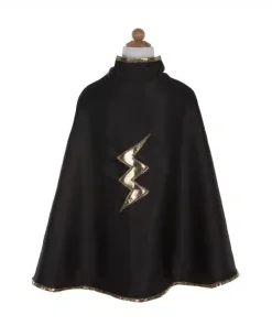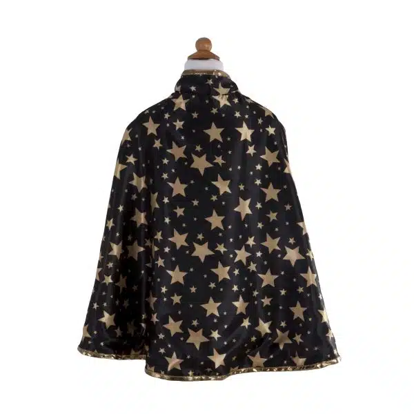 Questo mantello reversibile offre due look incantati: un lato nero con un fulmine dorato e l’altro tempestato di stelle dorate su raso nero.