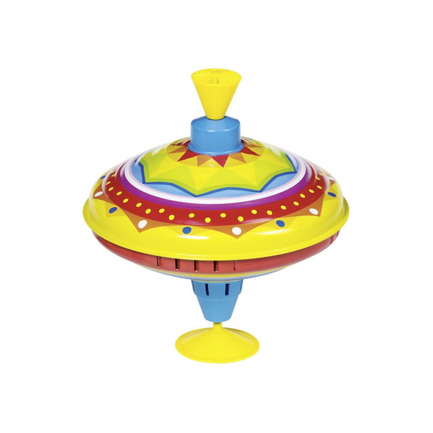 Una trottola in metallo. Basta muovere su e giù il pomello e la trottola comincia subito a girare emettendo un simpatico ronzio.