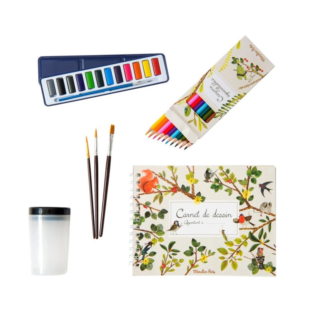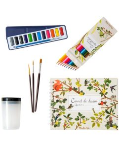 Una valigetta con dentro tutto l’occorrente per realizzare fantastici disegni. Acquerelli, pennelli, matite acquerellabili, un vasetto e un quaderno con carta per acquerello.