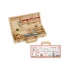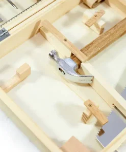Tutto l’universo del fai da te racchiuso in una valigetta di legno! Per fare come i grandi, costruire mondi e raccontare storie, 14 veri utensili: una sega, un martello, uno scalpello, una livella, un righello e una matita, cacciaviti…